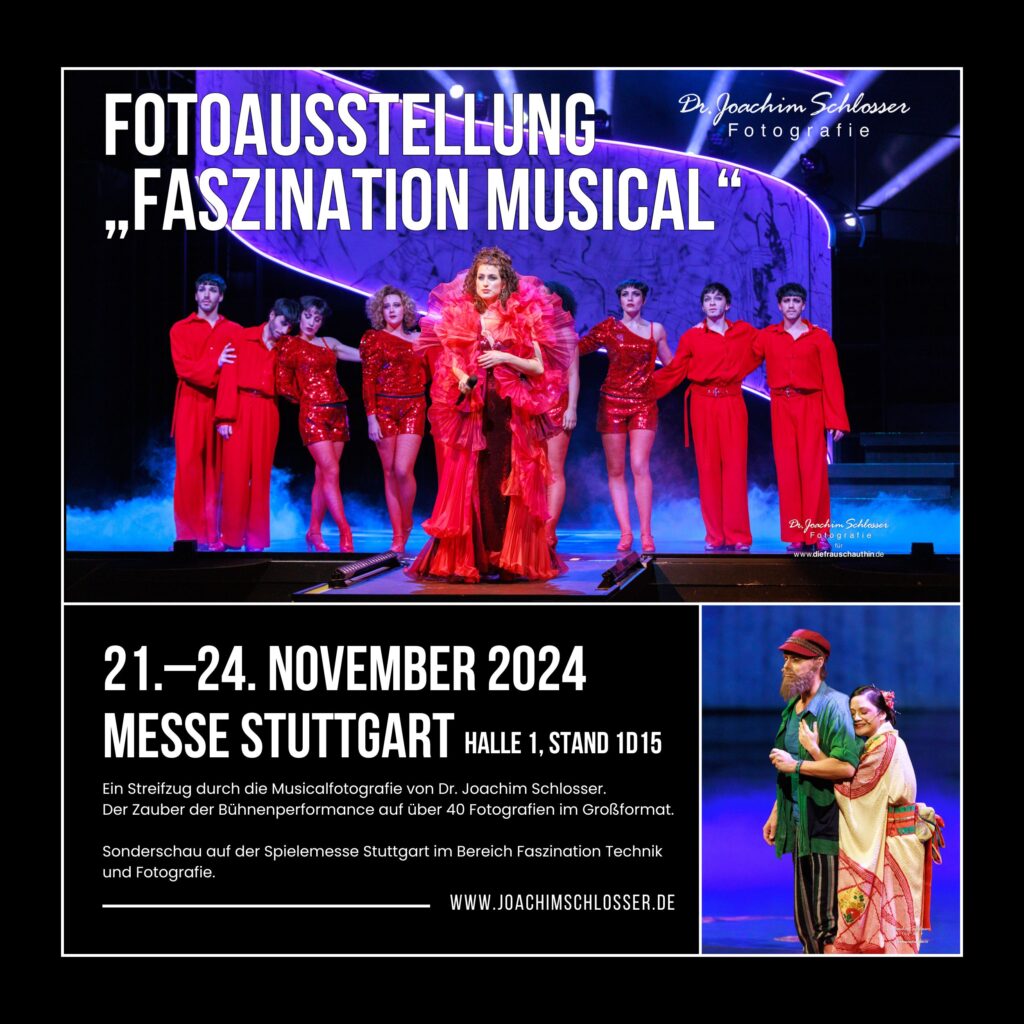 Und dann habe ich noch eine Ankündigung für Sie. An diesem Donnerstag bis Sonntag, 21.–24.11.2024, präsentiere ich in der Messe Stuttgart meine Fotoausstellung zum Thema „Faszination Musical“.